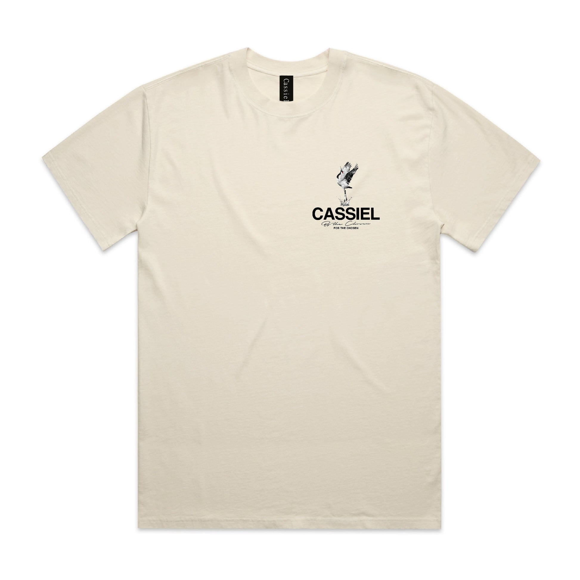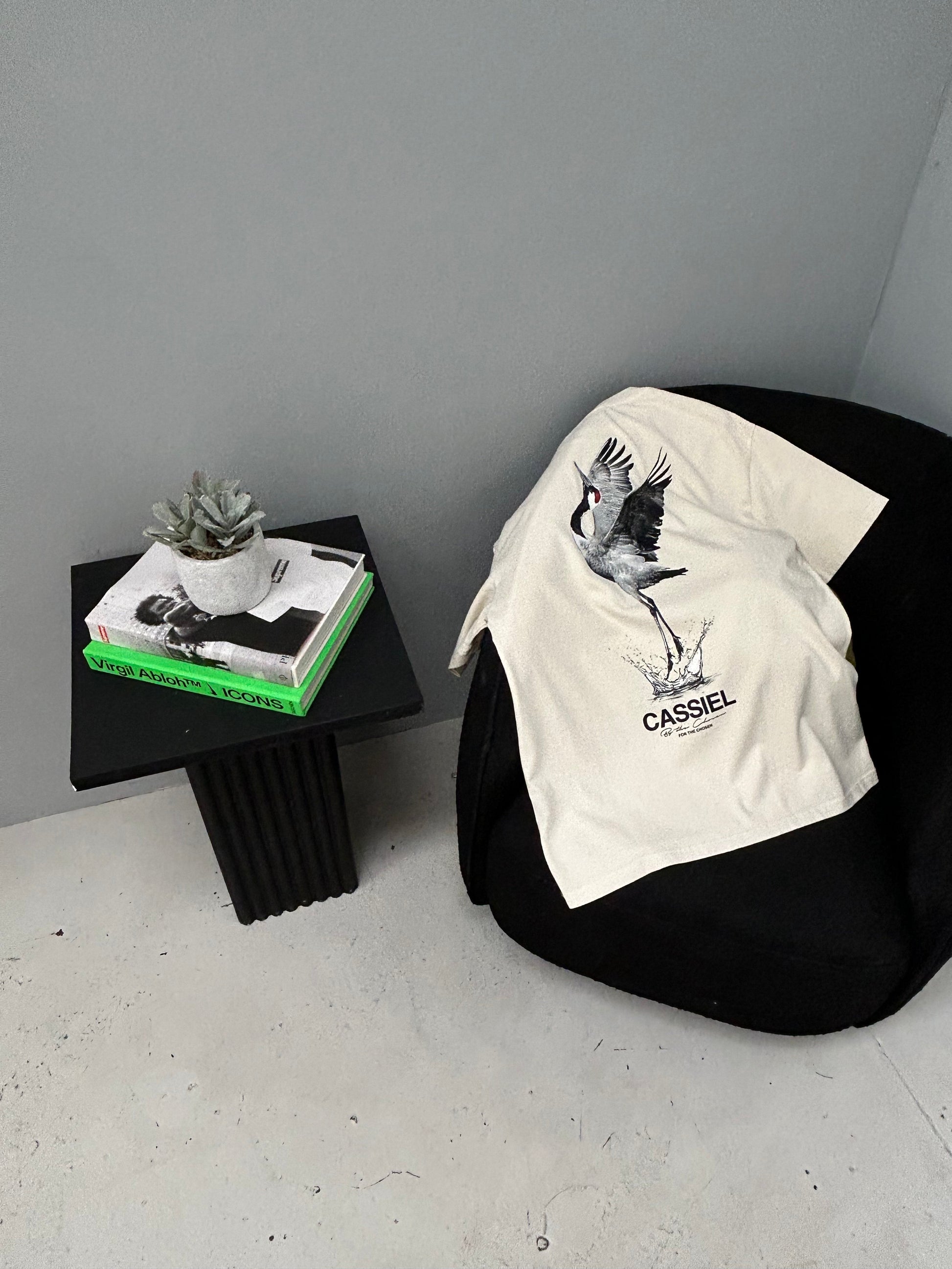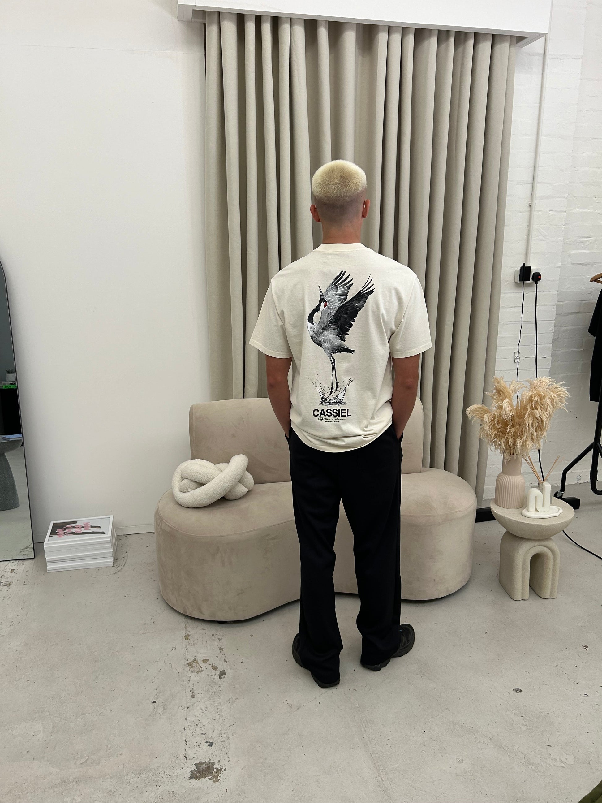Cassiel Crane logo tee made from cotton and finished in faded ecru.