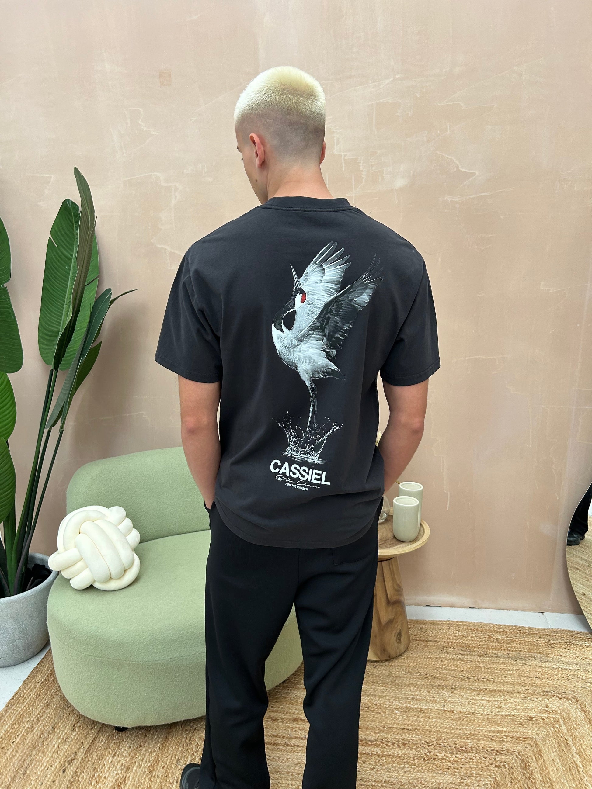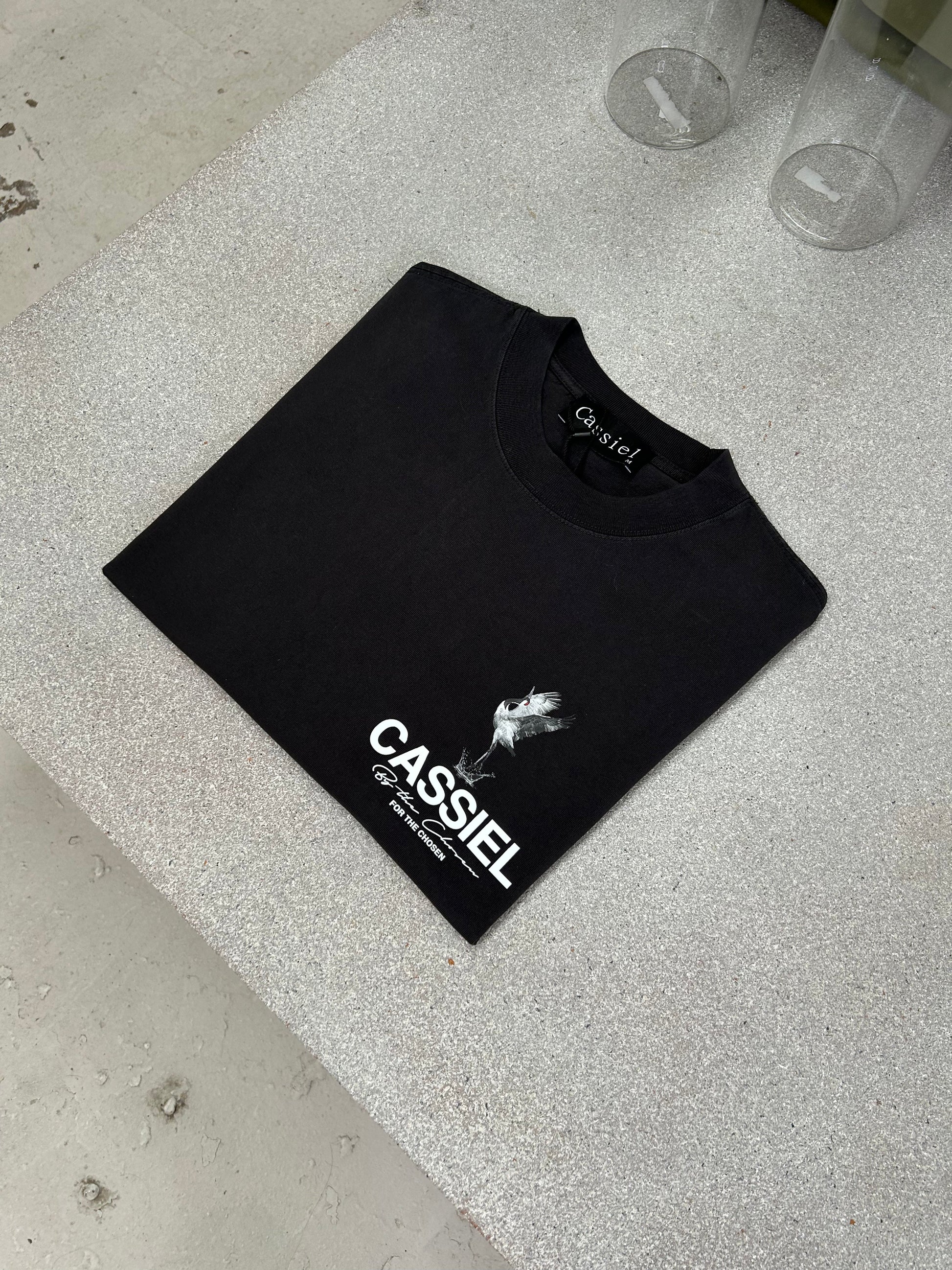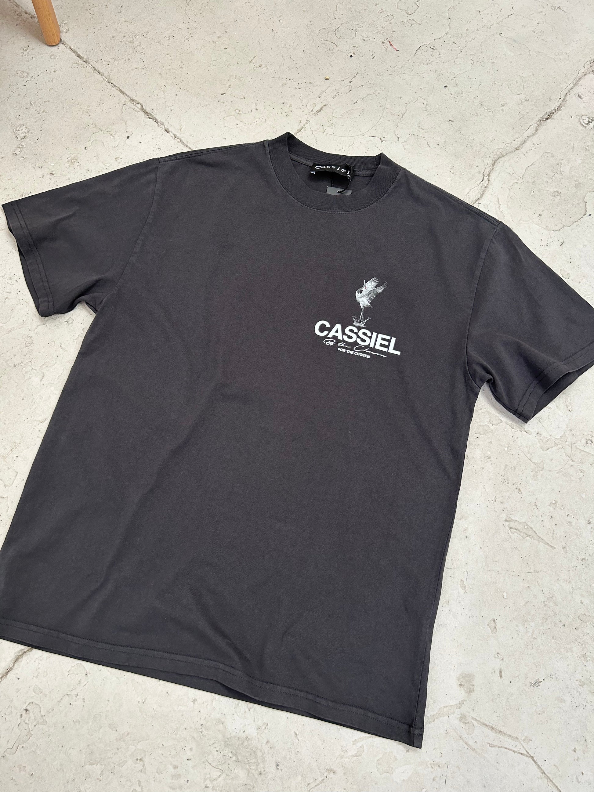 Cassiel Crane logo tee made from cotton and finished in faded black