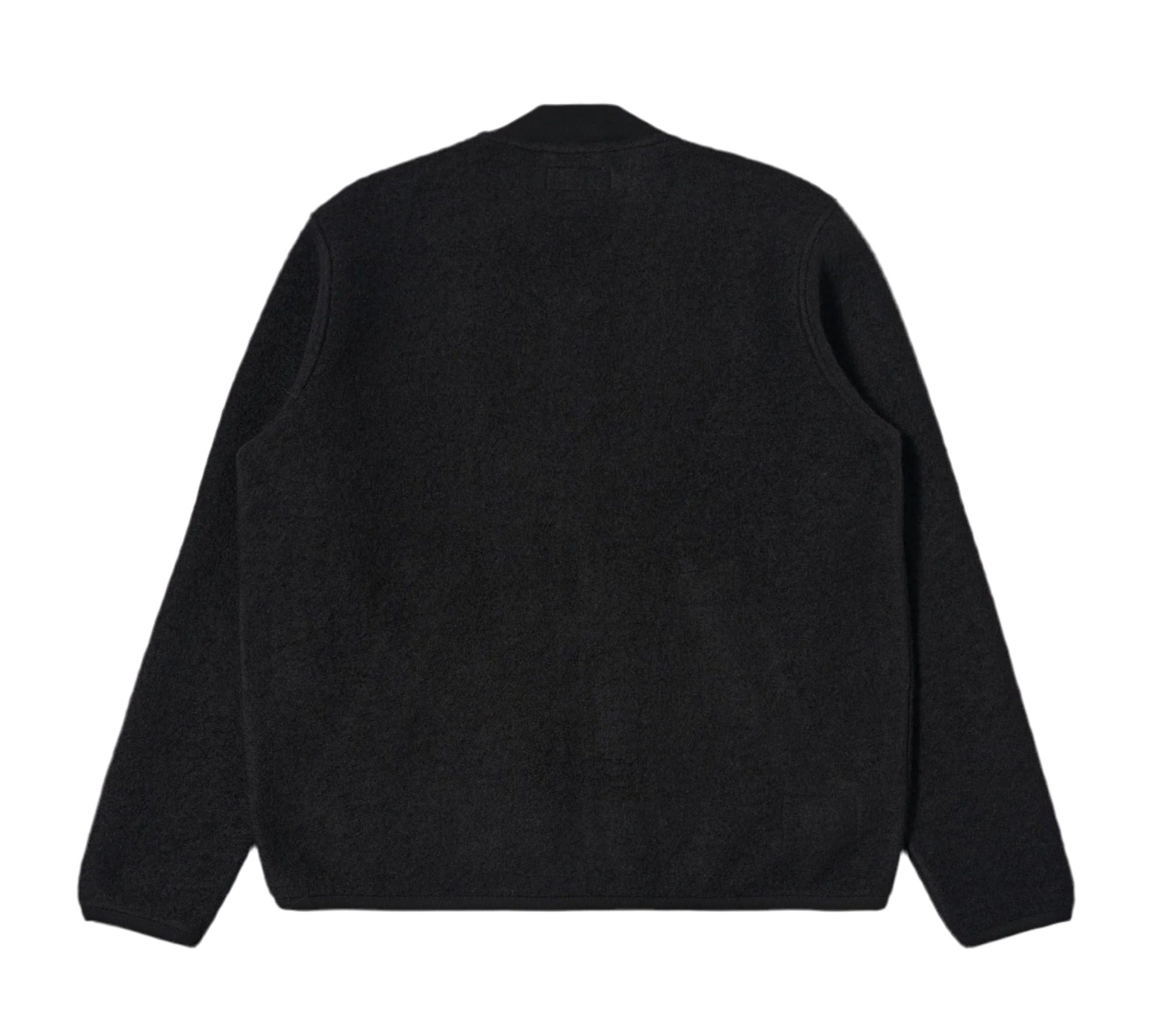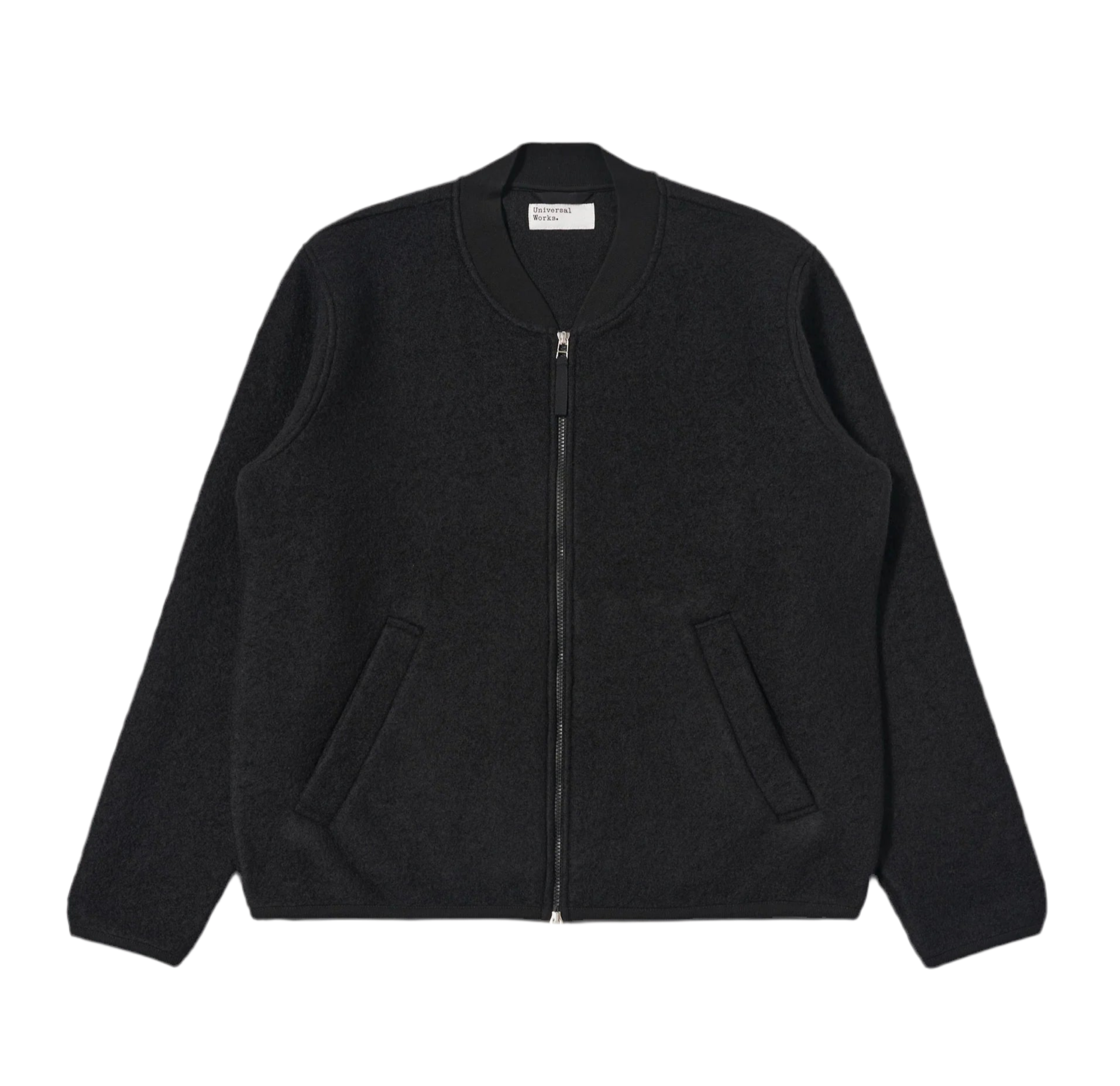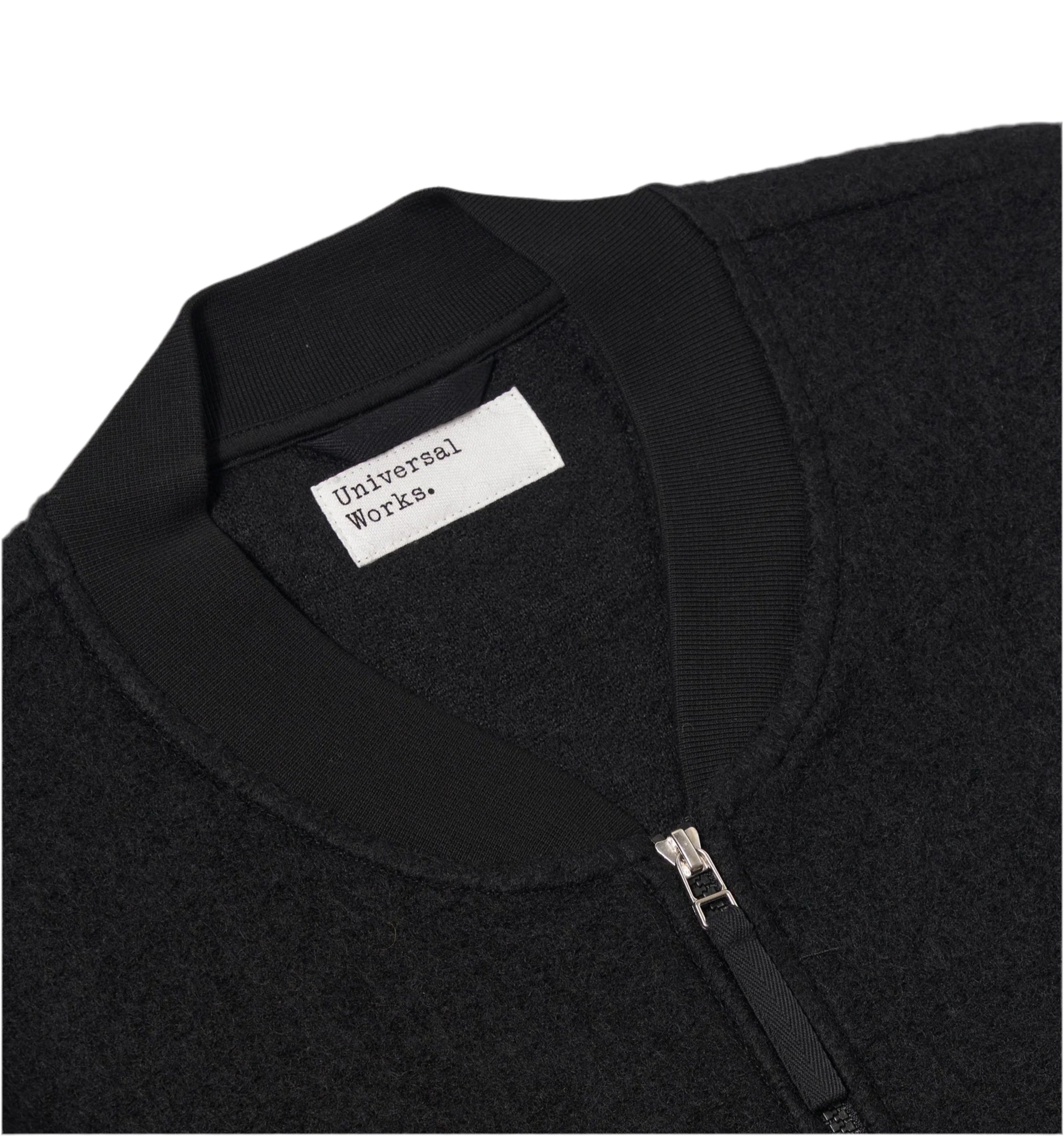 Universal Works wool fleece zip bomber made from a wool polyester mix and finished in black.