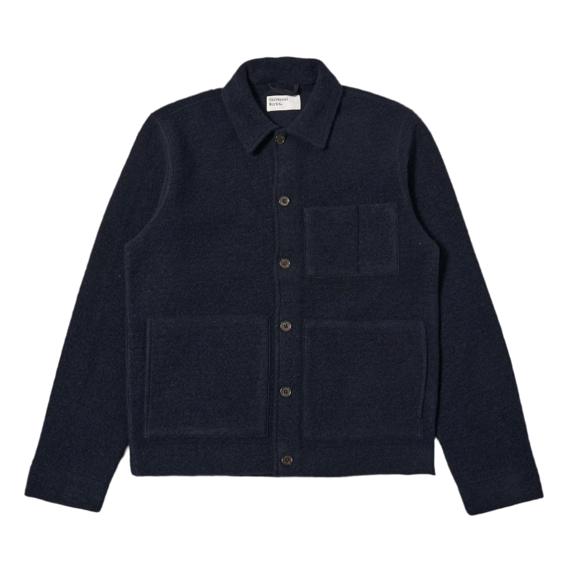 Universal Works wool fleece Uniform jacket made from a wool polyester mix and finished in navy.